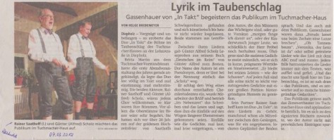 Der Amtshof in Lemförde war mit 150 Gästen komplett ausverkauft. Den Zuhörern hat es gefallen, sowohl die Gedichtsverse als auch die Gassenhauer aus alter Zeit (Comedian Harmonists, Fred Oldörp u.a.). Die Stimmung war ausgesprochen gut und ohne Zugaben wurden die beiden Akteure nicht von der Bühne gelassen. Ein ausführlicher Bericht ist nachzulesen im Diepholzer Kreisblatt vom 20.10.2017