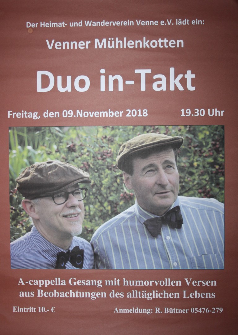 Im kleinen Ort Venne gibt einen sehr beschaulichen Kern mit alten Häusern, wo über den Heimat- und Wanderverein Venne e.V. viele Veranstaltungen mit viel Engagement organisiert und durchgeführt werden. So waren wir mit einer Lesung und A-Cappella am 19.11.2018 aktiv. Die über 30 Gäste kamen in den Mühlenkotten und trugen zur entspannten und fröhlichen Atmosphäre bei.