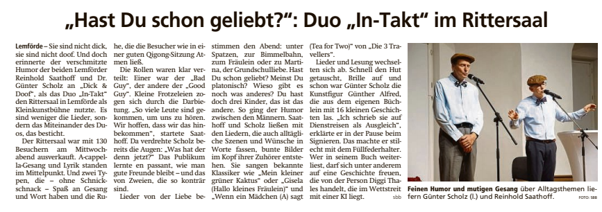 Der KulturBunt Lemförde organisiert eine Veranstaltung im Amtshof für das A-cappella-Duo In-Takt: Am 27.09.2023 war der Saal ausverkauft und wir hatten die Zuhörer auf unserer Seite. Die Kurzgeschichten "Erste Liebe", "Der Mönch" und "Im Sportstudio" kamen gut an. Der Zeitungsartikel aus dem Diepholzer Kreisblatt: